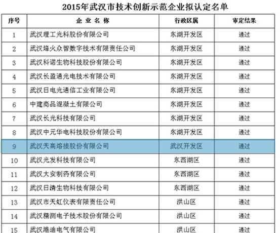 根据武汉市经信委、市财政局《关于印发的通知》(武经信科技〔2014〕98号,以下简称《认定办法》)的统一部署和要求,经过武汉市经信委办公会对通过实地核查的,经过初评、社会评议、专家评审等程序,最终确定了武汉天高熔接股份有限公司等18家企业入围“武汉市科技创新示范企业”称号。天高倡导“以人为本”的经营理念,坚持“诚信、创新”,致