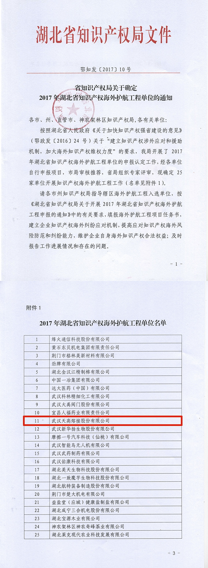 湖北省知识产权局确定25家知名企业为全省第二批知识产权海外护航工程企业,天高股份入选。这是公司被评为“第三批湖北省知识产权示范企业”之后获得的又一殊荣。